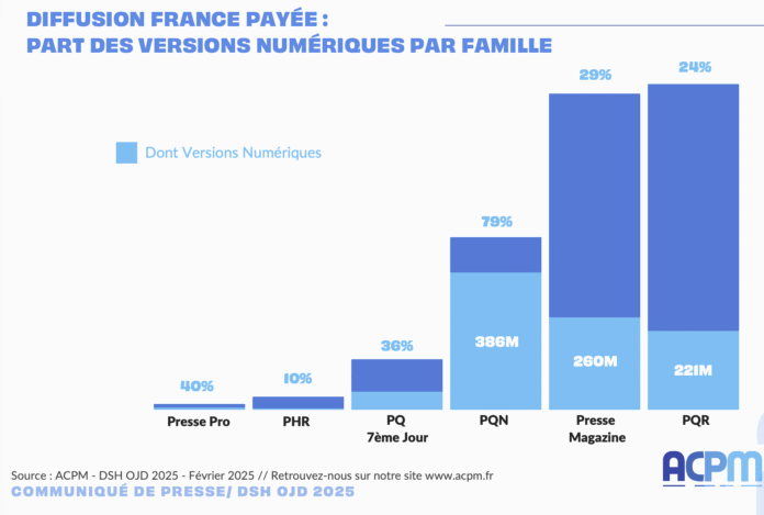 La diffusion de la presse s’inscrit une nouvelle fois à la baisse en 2025. Selon l’ACPM, la diffusion totale France a reculé de 2,2% par rapport à 2024, ce qui représente encore plus de 7 millions d’exemplaires par jour. Cette résilience s’explique bien sûr par le renouvellement éditorial des journaux et magazines, mais aussi une digitalisation de plus en plus forte. Désormais, la diffusion numérique individuelle constitue 31% de la diffusion France payée, bien au-dessus des ventes au numéro (20%), et pas très loin des abonnements (41%). Sur les 410 titres certifiés par l’ACPM, 64 ont enregistré une hausse de leur diffusion France payée, dont la moitié avec une évolution supérieure à 3%. Décryptage.