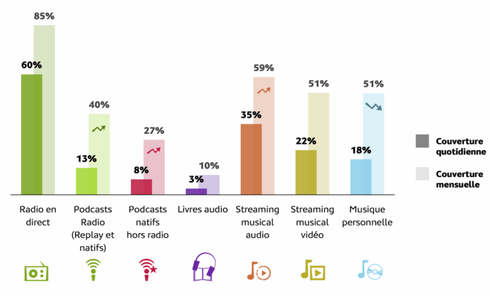 Malgré un recul de son écoute ces dernières années, la radio continue de fédérer toutes les générations, puisqu’elle touche 52% des 13-24 ans et 54% des 25-34 ans. Au total, 38,1 millions de Français écoutent la radio chaque jour, en direct ou en podcast, pour une durée d’écoute de 2h47 en moyenne (+2 minutes en un an). « La radio est un média historique à l’image parfois vieillissante, elle est challengée par la musique, les chaînes d’info et le divertissement, mais elle reste incontournable, assure Emmanuelle Le Goff. La radio en direct réunit sur une seule journée plus d’auditeurs que le streaming musical audio en un mois », même si le télétravail a accéléré l’érosion de l’écoute, puisqu’une bonne part se fait lors des trajets : 32% en voiture, 15% au travail, contre 50% à domicile.