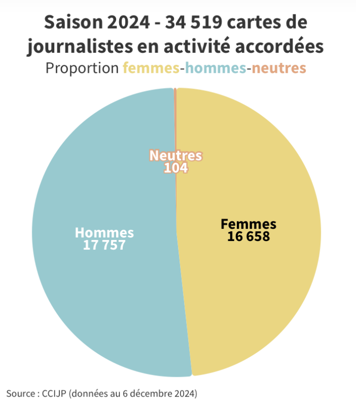 En 2024, la Commission de la Carte d’identité des journalistes professionnels (CCIJP) a délivré 34 948 cartes. C’est la deuxième année consécutive que ce chiffre est en hausse (+1,46% par rapport à 2023), ce qui permet de retrouver les niveaux d’avant Covid. Contrairement au millésime précédent, cette légère hausse n’est pas portée par les 2040 nouveaux entrants dans la profession, mais par les demandes de renouvellement (+1,83%). Les premières demandes sont en effet en baisse de 5,38%. Comme chaque année, la parité progresse à nouveau très légèrement (51,44% d’hommes, 48,26% de femmes et 0,3% de personnes ne s’identifiant pas à l’un de ces genres). Les premières demandes tirent cette parité vers le haut : 53,04% de demandes de femmes, 46,47% d’hommes.