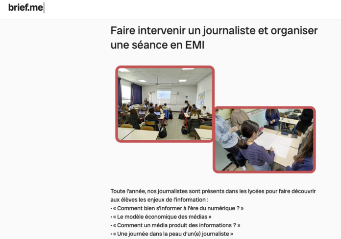 Déjà engagée toute l’année en faveur de l’éducation aux médias et à l’information (4000 ateliers organisés en 2025), la rédaction de Brief.me propose pour cette semaine une série de conférences, d’ateliers participatifs et de webinaires pour sensibiliser enseignants et élèves aux grands enjeux de l’information à l’ère du numérique. « Cet engagement est le prolongement naturel de notre offre éditoriale, soulignent ses fondateurs, Laurent Mauriac et Edmond Espanel. Brief.me a été imaginé pour rendre accessible l’actualité nationale et internationale au plus grand nombre chaque soir à 18h30, avec un traitement factuel, accessible et sans parti pris ». Les ateliers organisés dans des lycées partout en France aborderont des thématiques variées, comme Une journée dans la peau d’un(e) journaliste ; Qu’est-ce qu’un média ? Comment un média produit des informations ? Comment bien s’informer à l’ère du numérique, ou quels sont les modèles économiques de la presse ?