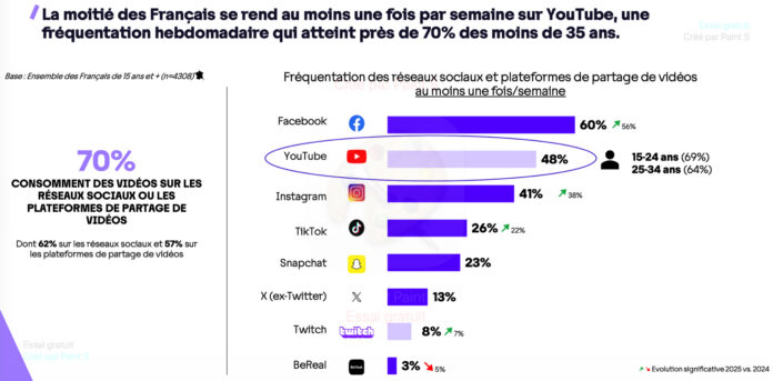Côté plateformes, Youtube prend de plus en plus de poids dans la consommation des Français. En 2025, 48% d’entre eux s’y sont rendus au moins une fois par semaine, ce qui la place au deuxième rang derrière Facebook (fréquenté au moins une fois par semaine par 60% des Français), mais devant Instagram (41%), TikTok (26%), Snapchat (23%), X (13%), Twitch (8%) et BeReal (3%). Cette fréquentation hebdomadaire concerne même 68% des moins de 35 ans, « qui sont profondément attachés à cette plateforme associant selon eux universalité (elle touche tous les publics), diversité, personnalisation des contenus et proximité, notamment au travers de la relation que construisent les créateurs de contenus avec leurs followers », souligne Juliette Théry.