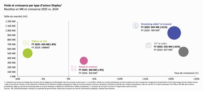 Cette apparente bonne santé masque néanmoins de vraies différences selon les acteurs du marché, en particulier au sein du display. Ce levier progresse encore de 11%, à 2,32 milliards d’euros, mais il est essentiellement tiré par la vidéo, qui représente 60% de ses recettes. « L’analyse par catégories d’acteurs met en évidence une divergence croissante des trajectoires », tient à préciser Maité Dailleau, partner chez Oliver Wyman. Les acteurs de la télévision et de la radio connaissent la progression la plus importante (+22%, à 535 millions d’euros), portée par la montée en puissance de la BVOD, des usages vidéo sur écran TV et de la bonne forme de l’audio digital. Les acteurs du streaming vidéo et musical poursuivent une croissance soutenue de 21% (à 945 millions) due à l’essor notable des plateformes de SVOD (+90%).
