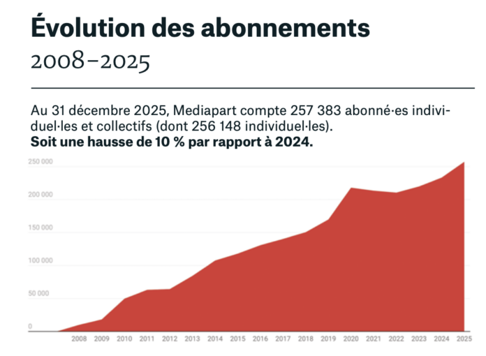 Dans une conjoncture économique et politique difficile, Médiapart a maintenu sa croissance en 2025, avec une progression de son nombre d’abonnés (+10%, à 257 383 fidèles), de son chiffre d’affaires (+12%, à 28 millions d’euros) et de son résultat net (4,424 millions d’euros). « L’actualité particulièrement chaotique a porté cet élan, analyse Carine Fouteau, présidente et directrice de publication de Médiapart. Notre couverture internationale a été marquée par le vertige fasciste infligé par Trump, le génocide à Gaza, l’interminable guerre en Ukraine, le massacre en Iran et l’accélération de la catastrophe climatique. En France, nous avons chroniqué les dangers de l’extrême-droite, ainsi que la corruption politico-financière sous toutes ses formes et les violences systémiques contre les personnes racisées, les femmes, les enfants et le corps social dans son ensemble ».
