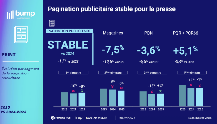 Si le marché publicitaire, dans son ensemble, a fait preuve de résilience l’an dernier, avec des recettes publicitaires nettes de 19,795 milliards d’euros, en progression de 3,3% par rapport à 2024, le bilan du Baromètre unifié du marché publicitaire (Bump), présenté hier 12 mars par l’Irep, France pub et Kantar, est beaucoup plus contrasté. Car cette croissance est essentiellement tirée par le digital, quand les cinq médias traditionnels (la télévision, la presse, la radio, la publicité extérieure et le cinéma) s’affichent tous en recul (à l’exception du cinéma, sur des petits volumes). En 2025, leurs recettes publicitaires ont ainsi baissé globalement de 6,5%, à 6,971 milliards d’euros. La presse, qui intègre depuis début 2025 le digital publisher, poursuit une tendance baissière : -6,4%, à 1,617 milliards d’euros, par rapport à 2024, et -10,2% par rapport à 2023.