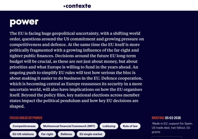 Comme nous l’avions annoncé dans les Clés de la presse du 12 décembre dernier, Contexte a lancé le 3 mars une nouvelle verticale éditoriale dédiée à l’analyse des dynamiques de pouvoir au sein de l’Union européenne, en anglais. Baptisée Power, elle propose une lecture stratégique des mécanismes décisionnels de l’UE, en se concentrant de manière factuelle et approfondie sur les rapports de force entre institutions et acteurs clés capables d’influencer les compromis. « L’objectif est non seulement de comprendre ce qui se décide à Bruxelles, mais aussi comment et pourquoi », précise la rédaction. Concrètement, les abonnés ont accès à un briefing quotidien, à des analyses approfondies et à des ressources éditoriales telles que trombinoscopes et infographies.